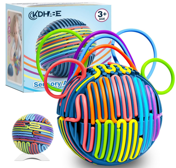 A tactile sensory ball featuring 24 colourful silicone strings and a display stand, offering hands-on opportunities for pressing, looping, and creating around the sphere. Supports fine motor skills, dexterity, and spatial awareness while providing a calming, screen-free activity for children. Priced at £15.99