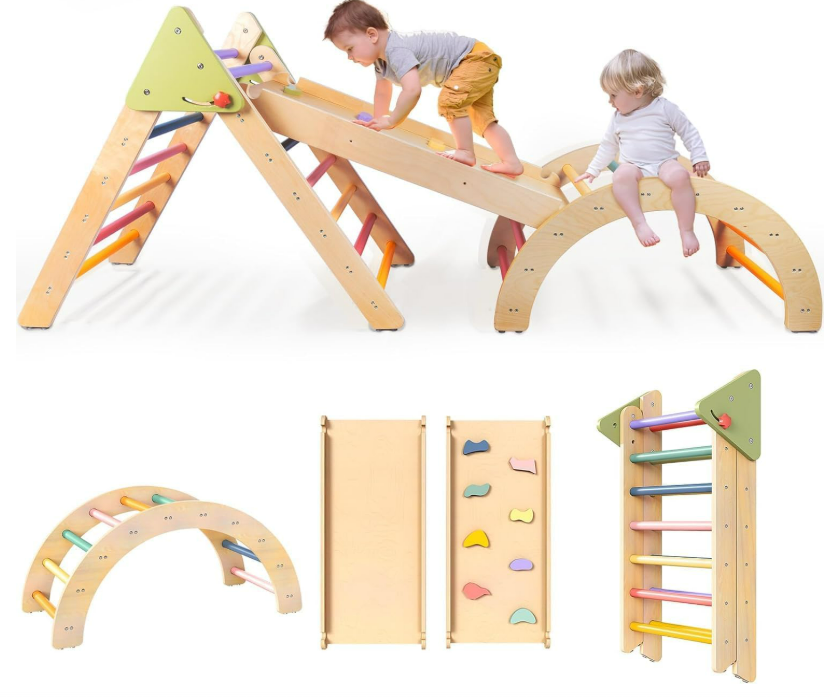 A versatile wooden play set that supports climbing, sliding, and gentle rocking as children explore movement at their own pace. The smooth surfaces, varied holds, and adjustable ramp offer opportunities for developing coordination, balance, and body awareness in an inviting indoor play environment. Priced at £84.99