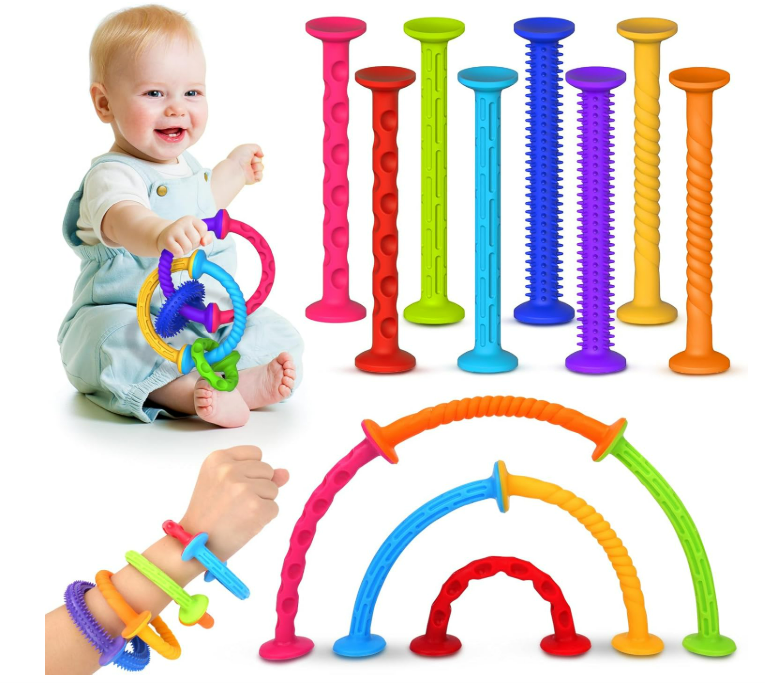 A set of colourful, textured silicone toys designed for tactile play. These suction cup toys provide sensory stimulation through different shapes, textures, and popping sounds, supporting fine motor skills and imaginative play during bath time or on smooth surfaces. Priced at £13.98