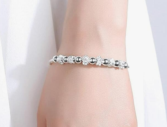 This stainless steel bracelet features a pearl-inspired design, offering a stylish and unusual accessory. It is durable, lead, nickel, and cadmium-free, and the adjustable chain allows for a comfortable fit. Priced at £4.79