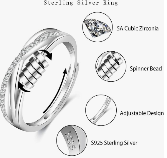 This adjustable spinner ring helps reduce anxiety and stress by keeping hands occupied, while also serving as a stylish accessory. Made from hypoallergenic 925 sterling silver with cubic zirconia, it comes in a gift-ready box! Priced at £16.99