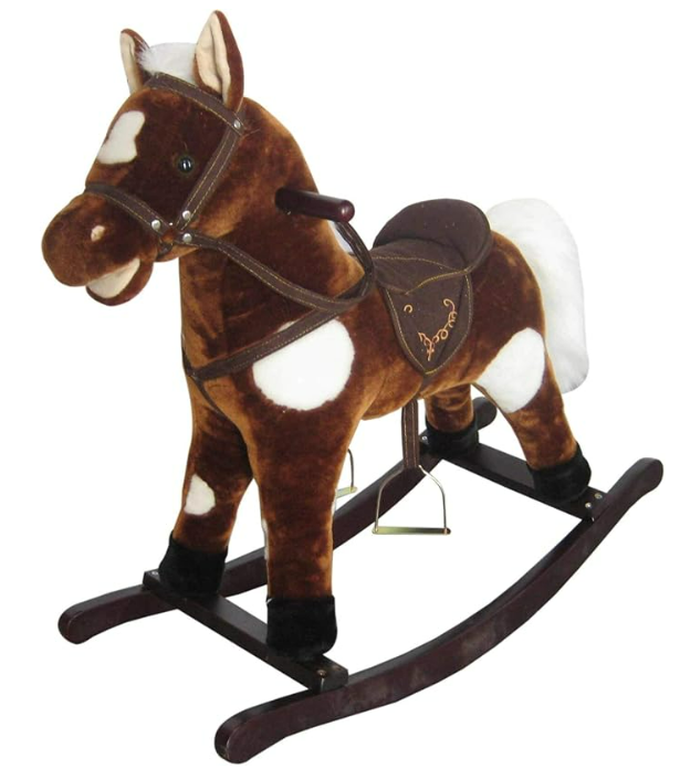 A plush rocking horse with a sturdy wooden frame and realistic sound effects. Children can develop balance and coordination while enjoying gentle rocking play, which provides vestibular sensory input. Priced at £59.95