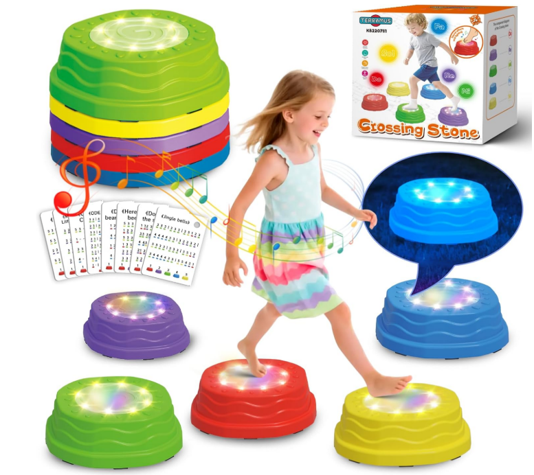 Interactive stepping stones that light up and play musical notes when stepped on, encouraging movement, balance, and colour recognition. Their tactile surfaces and sound responses provide a multisensory experience that combines physical activity with early music exploration. Priced at £42.99