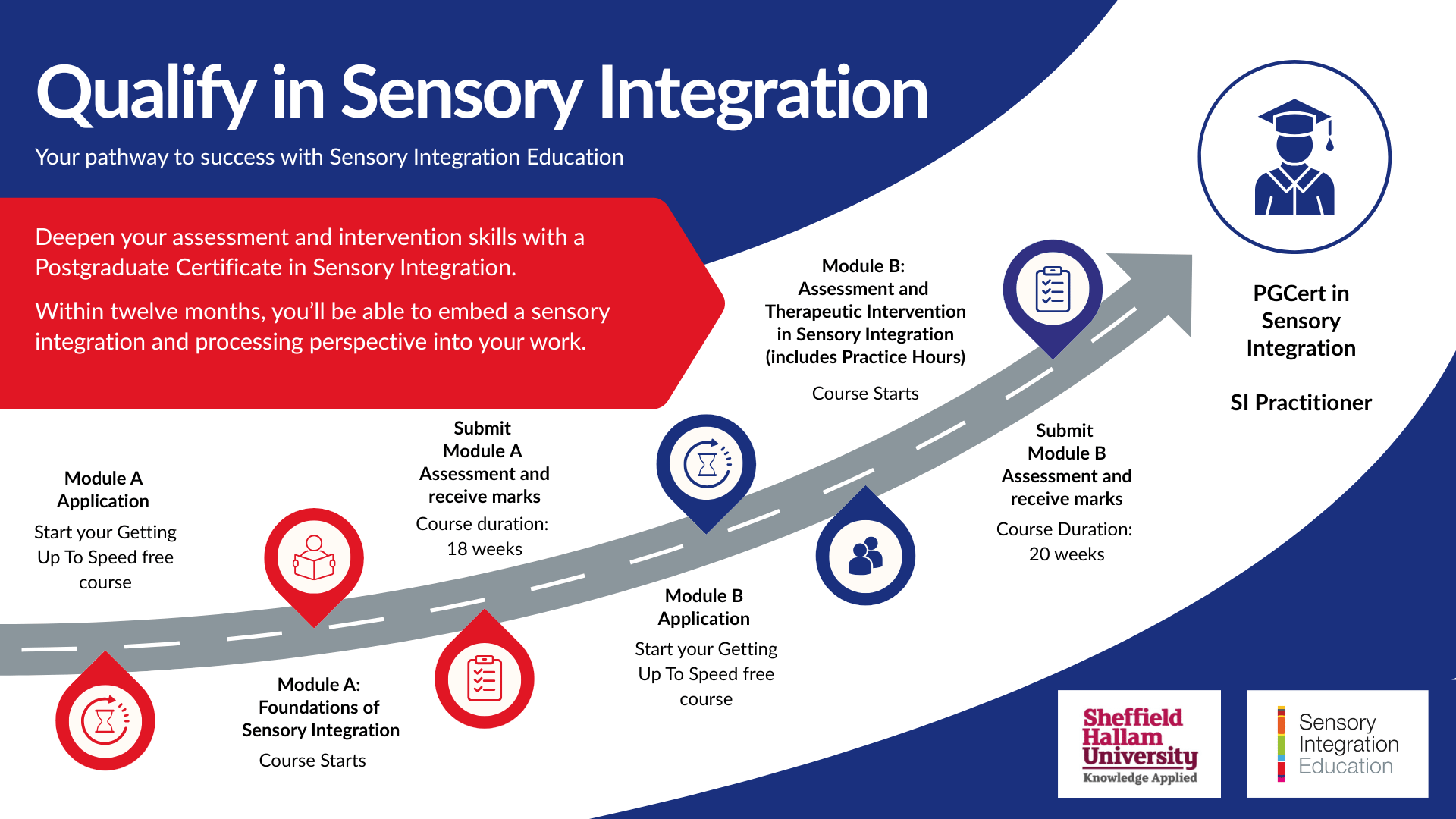 After successfully completing Modules A and B, you will have achieved 80 academic credits and be awarded a Postgraduate Certificate in Sensory Integration from Sheffield Hallam University. You will also receive the professional title of Sensory Integration Practitioner from Sensory Integration Education.