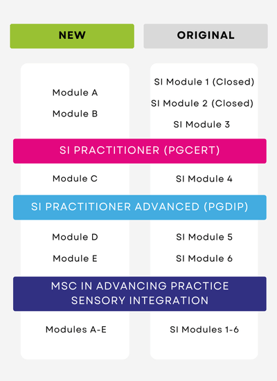 If you have completed SI Modules 1 and 2 with us, you can choose to transfer to the new programme and proceed directly to Module B to complete your PGCert in Sensory Integration.